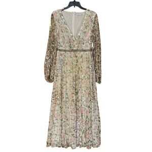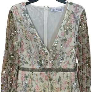 This dress features long blouson sleeves, adding a touch of elegance. The beaded waist detail enhances the silhouette, while the allover floral pattern, accented by clear hand-stitched sequins, brings a charming allure.