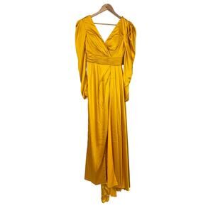 Mac Duggal NWT Yellow Faux Wrap Puff Shoulder Long Sleeve A-Line Gown Sz 4 *Flaw