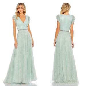 Mac Duggal NWT SEQUINED WRAP OVER RUFFLED CAP SLEEVE GOWN in Seamist Size 8