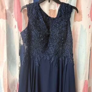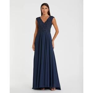 Mac Duggal Navy Applique Cap Sleeve Bodice Flowy Gown Gown Size 14