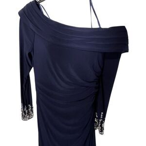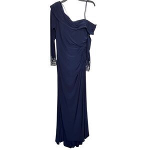 Elegant navy dress with long sleeves. Features an off-shoulder design and high slit. Embellished cuff detail.