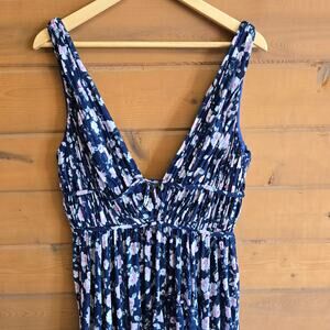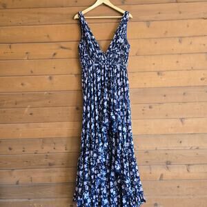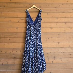 Beautiful navy all over floral high low style dress. The bottom is voluminous and very flowy. Has a hook clasp strap to go across the back and a hidden back zip that works smoothly. Has been dry cleaned after wearing.