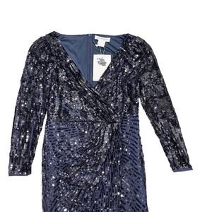 Elegant long sleeve dress. Features shimmering sequins. Deep navy color. Perfect for evening events.
