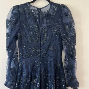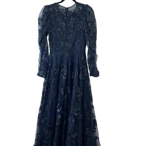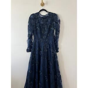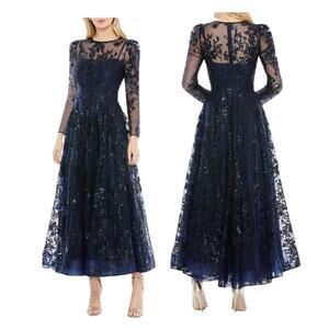 Mac Duggal Navy Sequin Sheer Lace Maxi Gown Prom Dress Womens 4 Long Sleeve