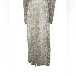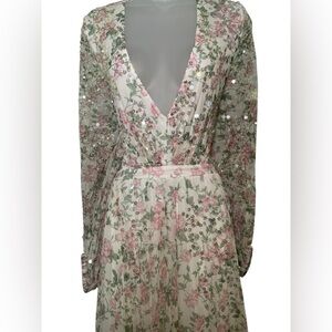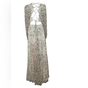 This stunning white multicolor floral gown is styled in chiffon with a plunging neckline, bishop sleeves, an open lace-up back, side waist cutouts, a slight brush train, and clear sequins.