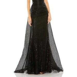 Shimmer with elegance in this Mac Duggal off-the-shoulder sequin gown. Perfect for prom, galas, or any formal affair, this radiant evening dress glitters from neckline to hem. Romantic banded sleeves drape gracefully over the arms, while the fully lined skirt, topped with a sheer sequin overlay, cascades to the floor in a flattering A-line silhouette. Both figure-enhancing and enchanting, this sparkling design ensures every step and twirl leaves a trail of timeless glamour.