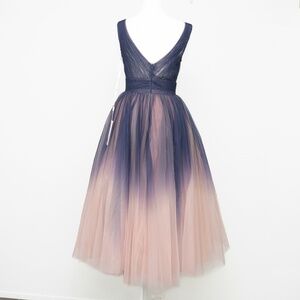 Float through any occasion in this Mac Duggal ombré tulle midi, a dreamy A-line style that shifts from deep indigo to lighter tones with an ethereal glow. The pleated bodice flatters with its V-neckline and wide straps, while a defined empire waistline gives way to a tea-length skirt that sways softly with each step. Finished with a concealed back zip, this sleeveless beauty balances elegance with ease—perfect for cocktail parties, weddings, or special evenings out.