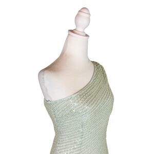 mac duggal, one shoulder gown, high low dress, mint green evening dress, pearl embellished gown, formal event outfit, wedding guest dress, designer eveningwear, luxury fashion, D3