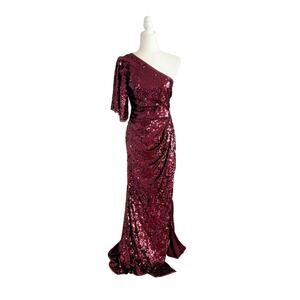 Tags: mac duggal, sequin gown, one shoulder dress, burgundy gown, formal wear, evening gown, sparkle, elegant, floor length, E8