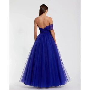 This one-shoulder Mac Duggal gown in vibrant royal blue showcases elegant tulle layers over satin, perfect for formal events with a sophisticated touch.