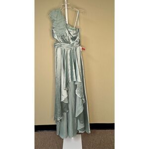 Elegant one-shoulder maxi dress. Features ruffle detailing. High-low hem design. Perfect for formal occasions.