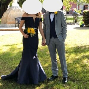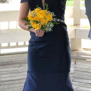 Beautiful Navy Prom or formal mermaid fit dress. I am 5’9” and I wore flats. Bra pads. I am small busted and it fit snug around me (If you’re large busted this might not work for you). I would say it fits more like a street size 6. Lined and a nice quality heavy satin fabric. Does not stretch.The jewel belt can be removed although it's high quality and looks beautiful! The split on the bodice has a skin-colored mesh that you can not see through but it does appear open from a distance.