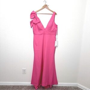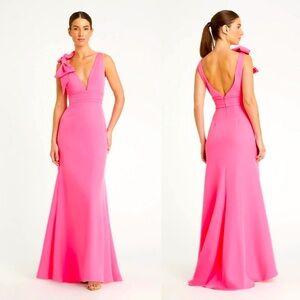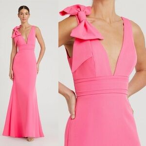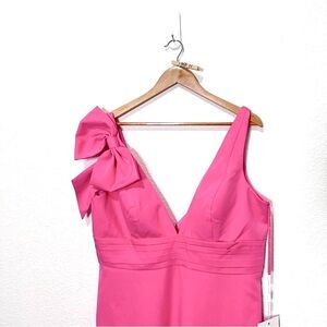 Elegant sleeveless gown with a plunging v-neckline, pleated waistband, asymmetrical bow-accented shoulder, and a sweeping train.