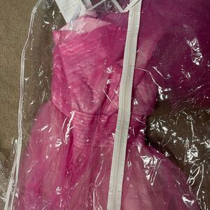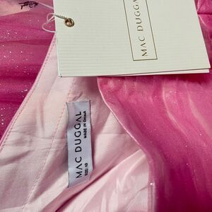 The Mac Duggal gown is a captivating choice for prom, showcasing a vibrant pink color and a sophisticated one-shoulder neckline. This elegant dress features short sleeves and a fitted bodice that flows into a full-length skirt, creating a graceful silhouette. Crafted with a light and airy fabric, it ensures a stunning presence at any formal occasion.