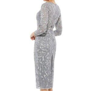 Mac Duggal Platinum Gray Beaded Long Sleeve Midi Dress