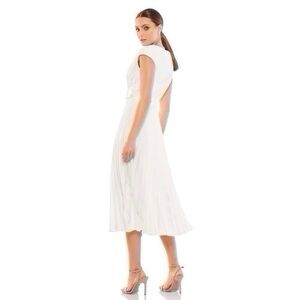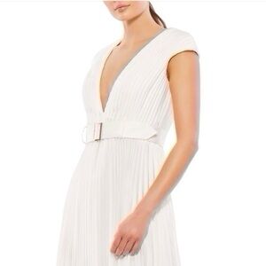 Mac Duggal Pleated Cap Sleeve Belted A-line Midi Dress Gown White