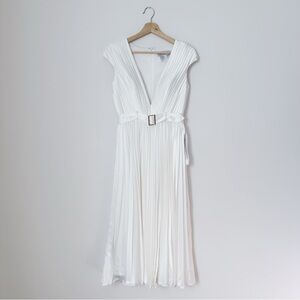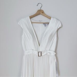 Mac Duggal Pleated Cap Sleeve Belted A-line Midi Dress Gown Whiteb