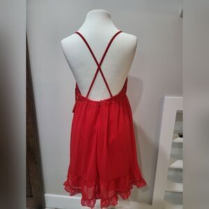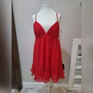 Spaghetti strap chiffon babydoll dress with a v-neckline, criss-cross back, and a flirty ruffled hem.