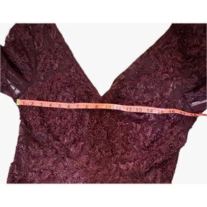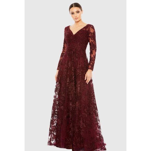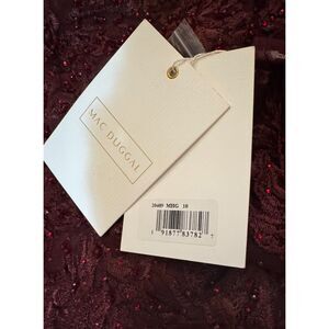 Mac Duggal Red Embellished Illusion V Neck Long Sleeve Gown, 10, NWT