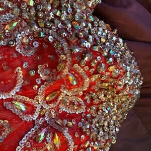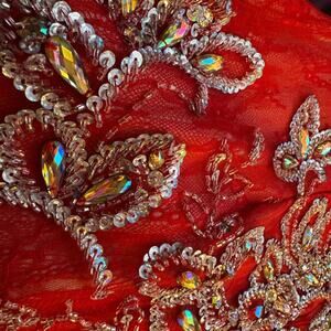 Dazzling red strapless dress with gold embellishments. Perfect for prom or formal events.