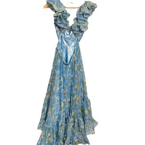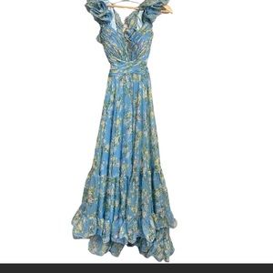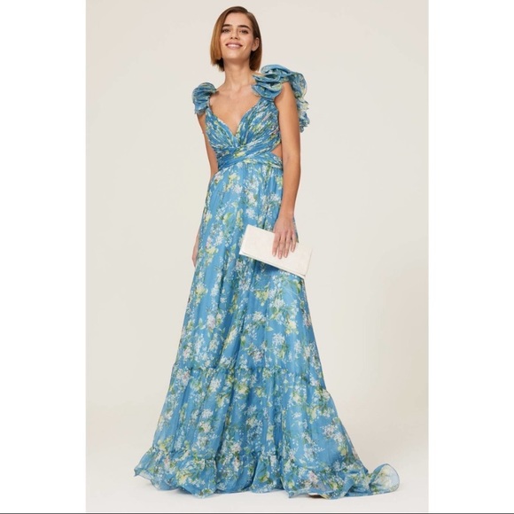 Max Duggal designer ballgown with ruffle sleeves and open back design. Very flattering on and perfect for any formal event, black tie wedding, or prom.