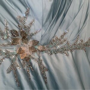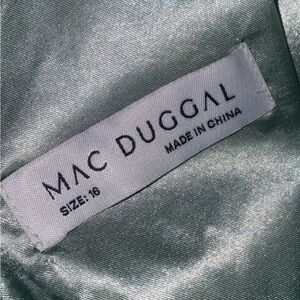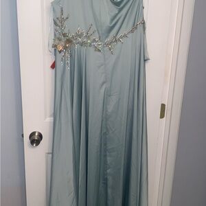 This dress has stunning ruching to hide any insecurity and comes in a beautiful sage color. It is one shoulder and a size 16. This gown has a shorter under slip and the skirt is sewn over it with a very dramatic slit in the leg. Offering a high- low effect. It is a very true size 16, and because it is satin material it has no stretch to it. BRAND NEW WITHOUT PURCHASE TAG. STILL HAS RED REMOVABLE TAG. NEVER BEEN WORN. PERFECT CONDITION