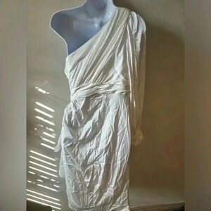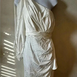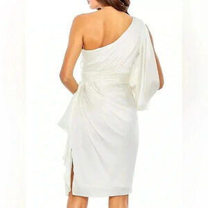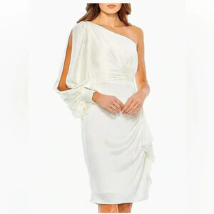 Cut from radiant satin, Mac Duggal’s one-shoulder dress features playful ruffle trim.
