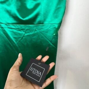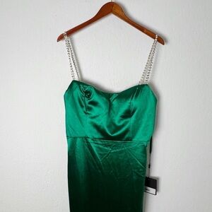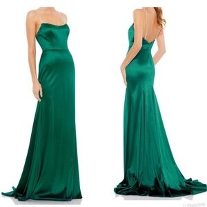 This satin gown hangs from shimmering crystal encrusted straps to add a touch of extra glamour to a classic silhouette featuring a flattering open back.