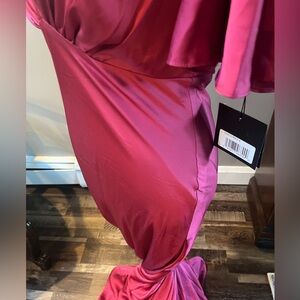 Old Hollywood Glamour! This satin full length gown has full bell sleeves with a deep V Neckline. The color is Raspberry. Pit to pit is approximately 16 inches