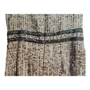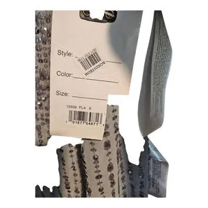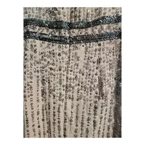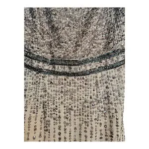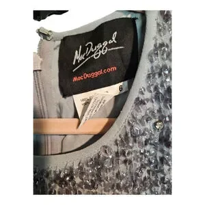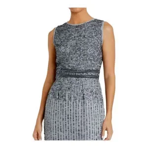 This new with tags Mac Duggal women's midi dress, size 6, is presented in grey. The sleeveless design features a round neckline and is heavily embellished with sequins throughout, creating a shimmering effect. A distinct beaded waistband separates the fitted bodice from the straight skirt, which displays vertical rows of sequins and includes a back slit. The garment is constructed from 100% polyester, as indicated on the care tag, and comes with a small bag of spare embellishments. A smal area of sequins can be replaced with the bead package.