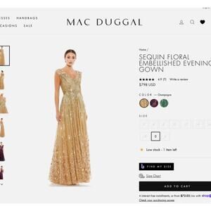 Mac Duggal Sequin Floral Embellished Evening Gown Gold Size 10 NWT. Floor-length evening gown cascading sequin stripes, exquisite 3D floral embellishments at the shoulders and bottom hem, and a sweeping A-line hem. Mac Duggal. Sequin Fabric (100% polyester). Fully lined. V-neck. Cap sleeve. 3D Floral embellishments. Concealed back zipper. Approx. 62.5" from top of shoulder to bottom hem.