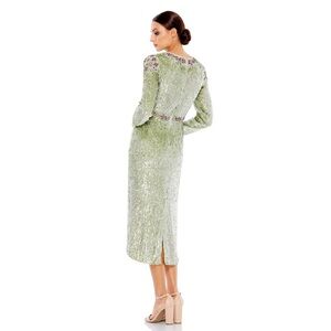 New With Tag. Mac Duggal Green FLORAL BEADED TEA-LENGTH DRESS. Size 10. If a diamond necklace is your coveted accessory, then this decadent style is your wish list dress. The sensational dress is cut in a modest midi sheath completely covered in sequins that add texture and shine. Bloom-arranged jewels glitter at the collar, shoulders, and waist in a belt-like accent.