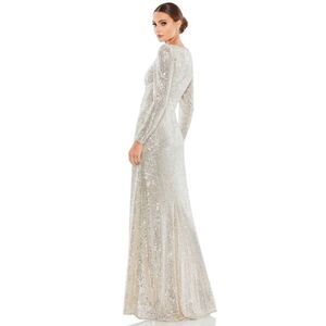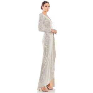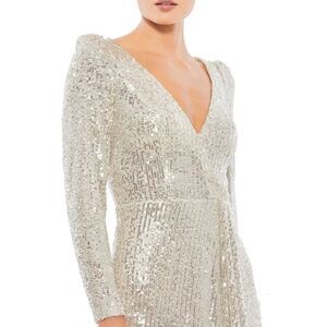 Glamorous gown styled in a flattering faux wrap silhouette with a dazzling sequin finish.