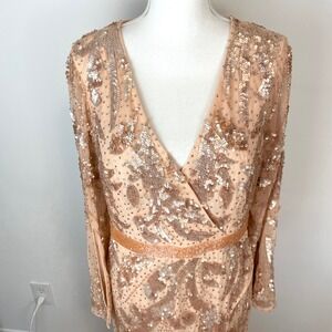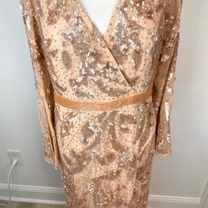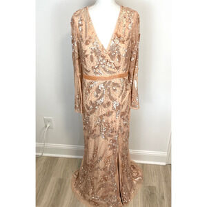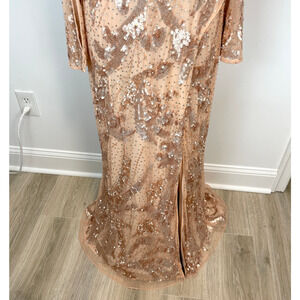 Mac Duggal Sequined Faux Wrap Split Long Sleeve Gown Rose Gold 5222 Size 12
