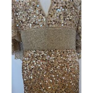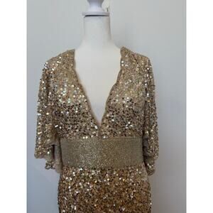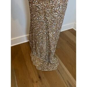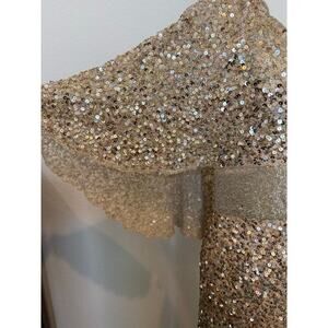 Mac Duggal Sequined V Neck Cape Sleeve Beaded Gown Champagne Nude 12
