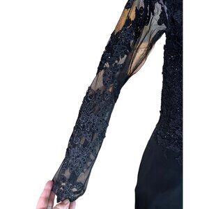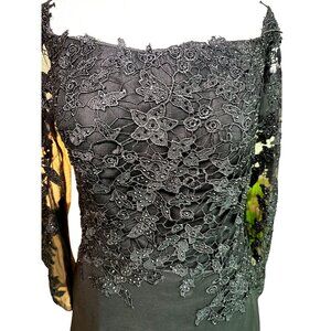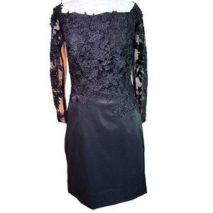 This stunning Mac Duggal cocktail dress features intricate beading, sequins, appliques and lace. Designed in a sheath silhouette with an off-shoulder neckline, it is perfect for elegant occasions. It the perfect LIttle Black Dress, fitted, sexy, illusion Long Sleeves
