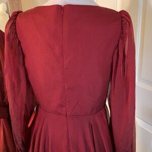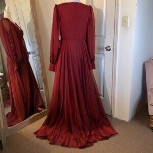 Flowing gown with sheer blouson sleeves, a pleated faux-wrap bodice, v-neckline, and a floor-length m chiffon skirt with a sweeping train.