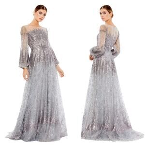 Mac Duggal Silver Jewel Encrusted Illusion Long Sleeve A Line Gown