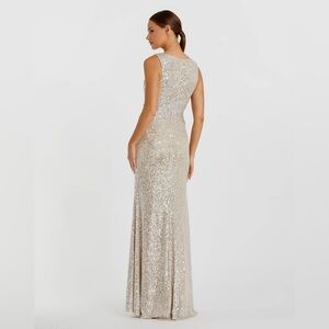 mac duggal gown, sequin evening dress, silver formal gown, nude sequin dress, v neck maxi dress, wrap waist gown, prom dress, gala dress, wedding guest dress, formal event outfit, new year’s eve dress, mother of the bride gown