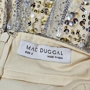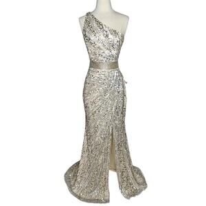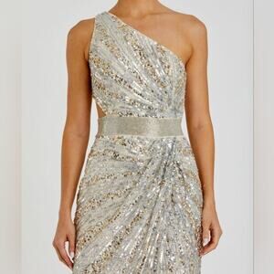 Mac Duggal Silver Sequined One Shoulder Draped Lace Up Gown Size 2 NEW