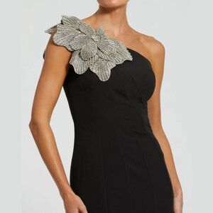 Captivate effortlessly in this crepe one shoulder gown featuring a sleek one-shoulder design with a rhinestone flower detail and trumpet silhouette.
