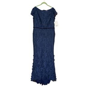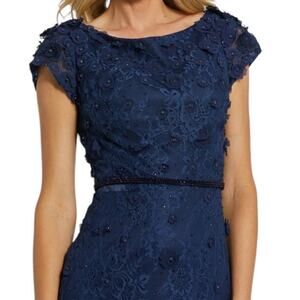 Mac Duggal Style 67711 Women's Size 18 Blue Floral Applique Boat Neck Short Sleeve Gown Midnight Blue New With Tag
