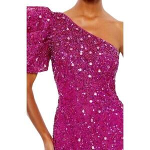 This Mac Duggal hot pink formal dress charms with abstract beadwork all over its fitted silhouette, with a puff sleeve edging the one-shoulder neckline and a side slit.