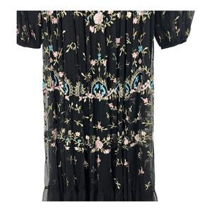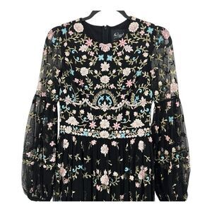 The round neckline of the dress is super modest. The puff sleeves are mesh and dramatic. The bodice is tight followed by a gorgeous A-line silhouette. The dress is intensely floral-patterned from the top to the thigh area. The lower portion is solid-patterned with an elegant mesh hemline.