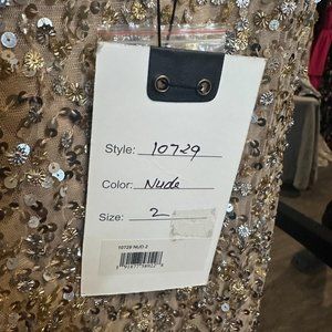 New with tags, including extra beads, Ieena by Mac Duggal. It’s a gorgeous nude dress covered in gold and silver shiny beads and sequins. They are placed in a flashy pattern picked up well by lighting.