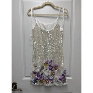 White Sequined Mixed Media Floral Embellished Mini Dress