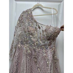 Inspired by constellations in the starry night sky, the embroidery on this dress is detailed with miniature twinkling rhinestones. The statement ballgown boasts an asymmetrical neckline with a single wrist-length sleeve, sheer bodice with enchanting leaf appliqué, and a full tulle skirt fit for any princess.