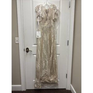 Mac Duggal Size 6 Ivory Nude Embellished Flutter Sleeve Lace A-Line Gown $798