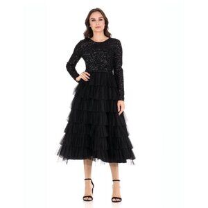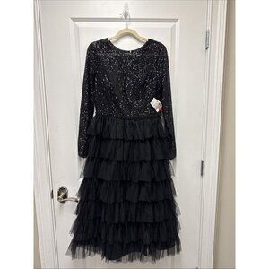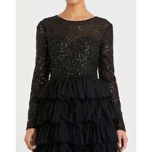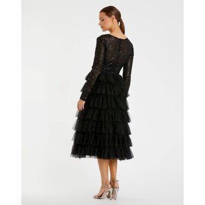 Mac Duggal Size 8 Black 26299 Sequin Long Sleeve Ruffle Tiered Midi Dress $498