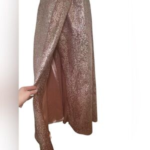 Mac Duggal gown, brocade dress, pink gold formal dress, strapless evening gown, metallic prom dress, designer sample dress, exclusive Mac Duggal, gown with slit, luxury formalwear, rare Mac Duggal sample, couture gown